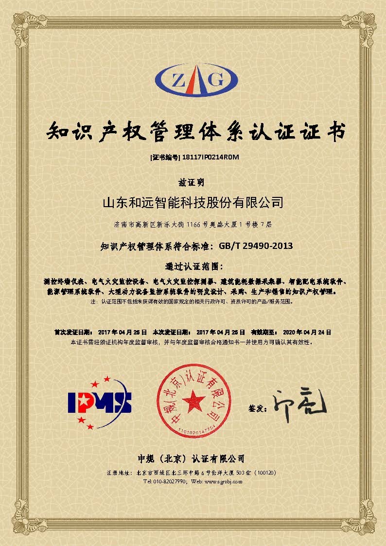和遠智能嚴格按照GB/T 29490-2013《企業(yè)知識產(chǎn)權(quán)管理規(guī)范》的規(guī)定,建立企業(yè)知識產(chǎn)權(quán)管理標準體系,設置專人負責專利的申報管理工作,從產(chǎn)品研發(fā)到推廣過程中的知識產(chǎn)權(quán)獲得、保護、實施、激勵進行有效的管理。公司已于2017年4月取得知識產(chǎn)權(quán)管理體系認證證書。